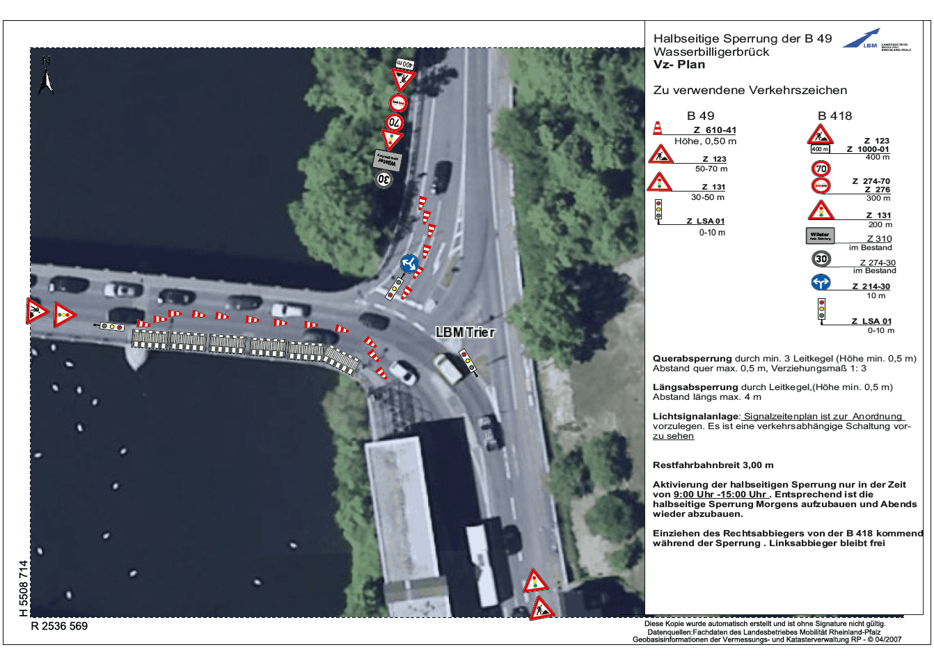 im Zuge der Sanierungsarbeiten des Unfallschadens am Geländer im Streckenverlauf der B049 Grenzbrücke Wasserbilligerbrück und Wasserbillig, muss dieser Bereich halbseitig mit Lichtzeichenanlage (LZA) gesperrt werden. Die Arbeiten sollen, aufgrund der vorliegenden Verkehrsstärke und verkehrlichen Entlastung, täglich im Zeitraum von 09:00 – 15:00 Uhr ausgeführt werden. Die Durchführung ist aufgrund der umfangreichen Arbeiten und Lieferfristen in zwei Phasen gemäß oben genannten Zeiträumen vorgesehen.